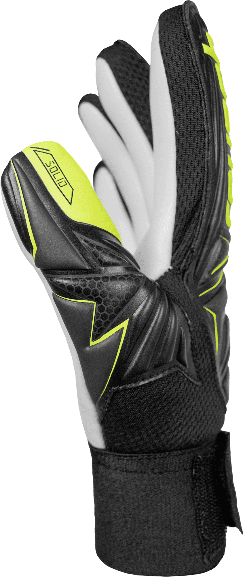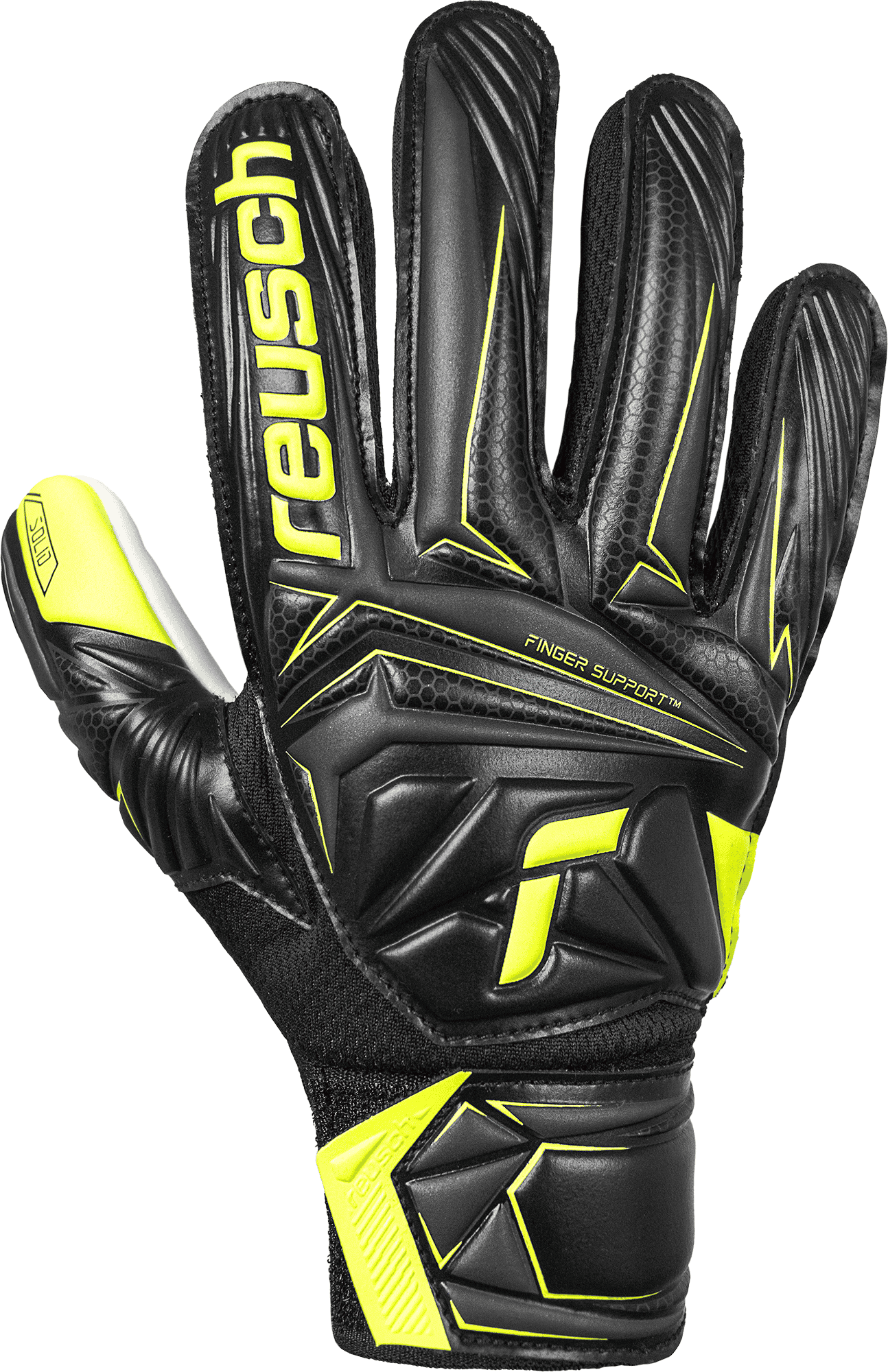The Attrakt Starter Solid Finger Support Junior is equipped with durable Reusch Solid palm and built-in Finger Support™ spines for enhanced protection and stability of all five fingers. The Negative Cut ensures a secure, close fit, while the half strap and open elastic cuff make it easy to put on and adjust. Ideal for training and recreational matches.Material Composition